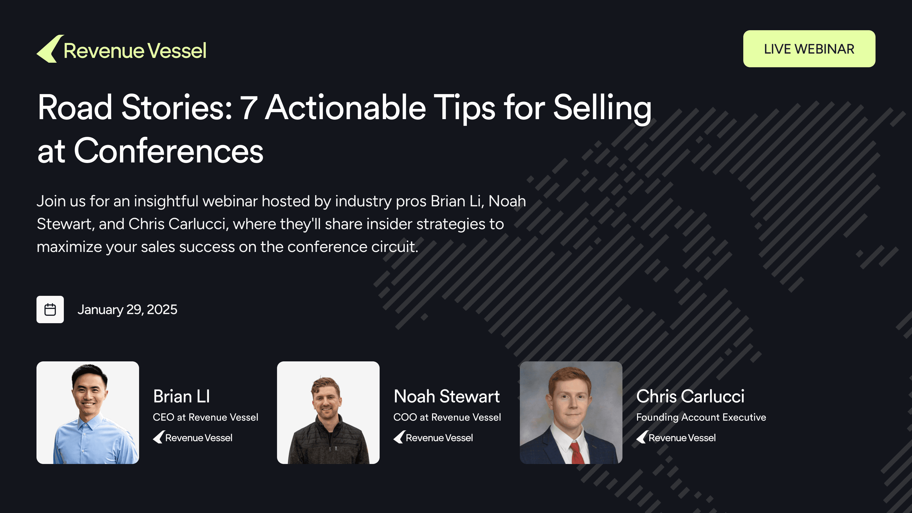 Join us for an insightful webinar hosted by industry pros Brian Li, Noah Stewart, and Chris Carlucci, where they'll share insider strategies to maximize your sales success on the conference circuit.