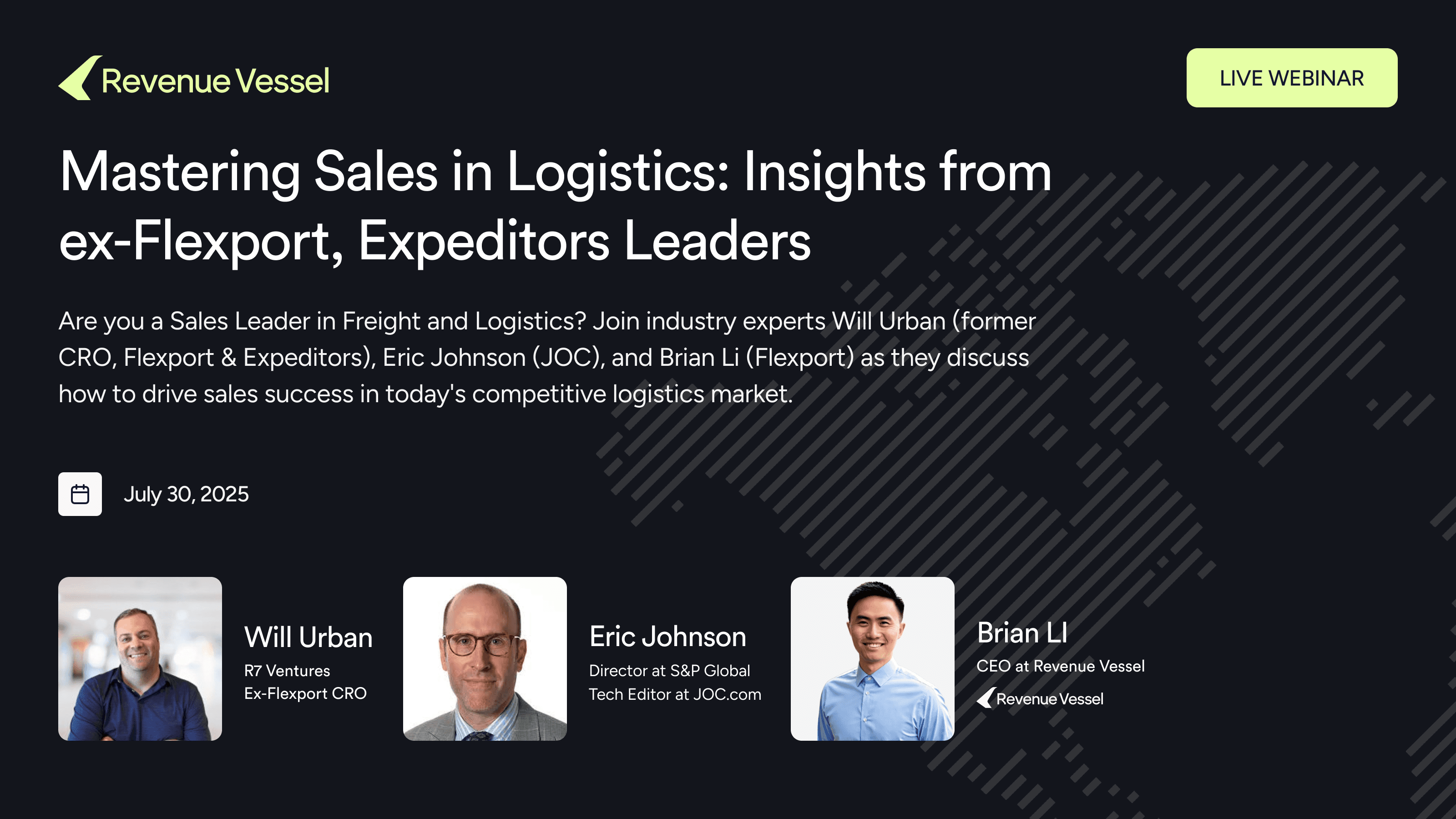 Are you a Sales Leader in Freight and Logistics? Join industry experts Will Urban (former CRO, Flexport & Expeditors), Eric Johnson (JOC), and Brian Li (Flexport) as they discuss how to drive sales success in today's competitive logistics market.