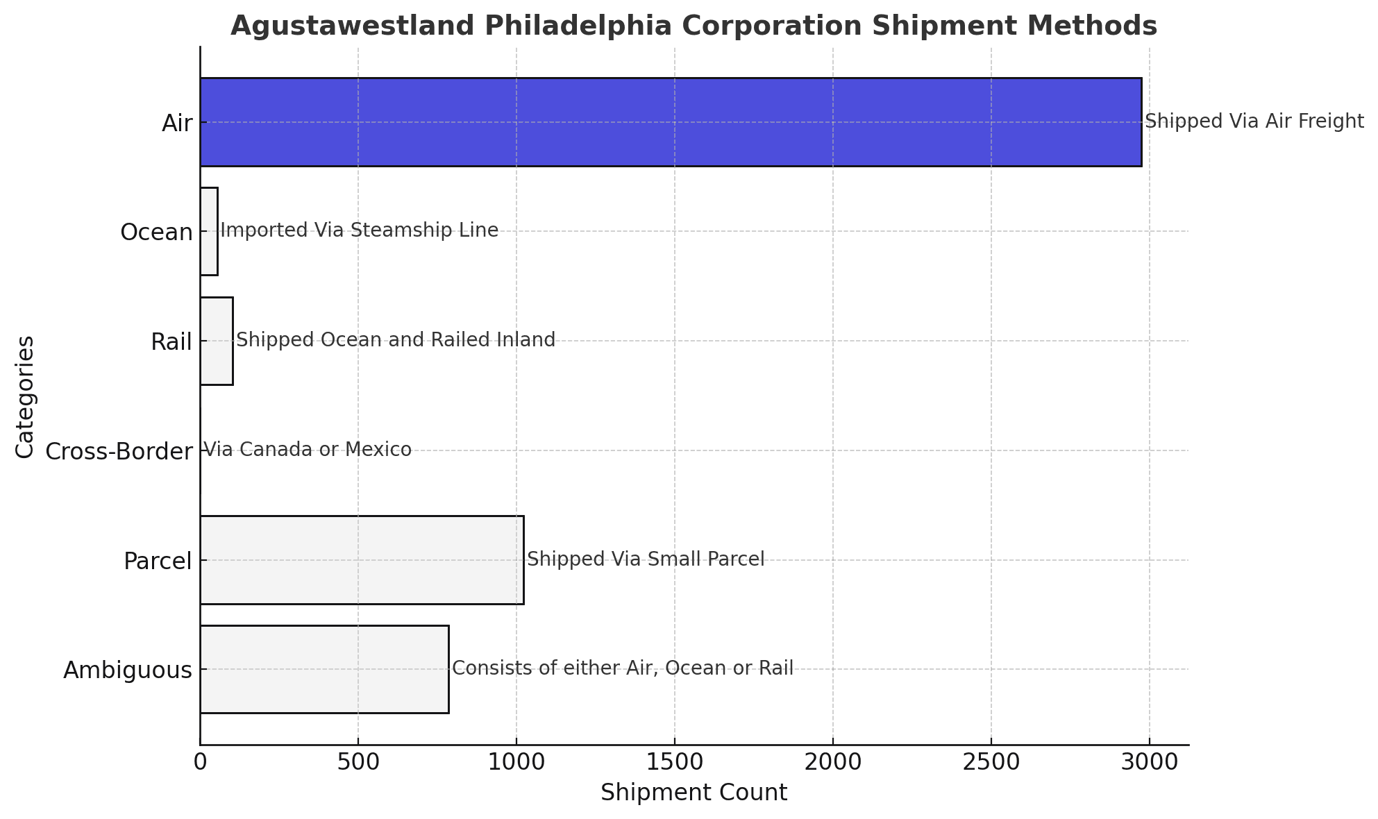 Agustawestland Philadelphia Corporation shipment data consists of 1% ocean, 2% rail, 60% air, among other modes.
