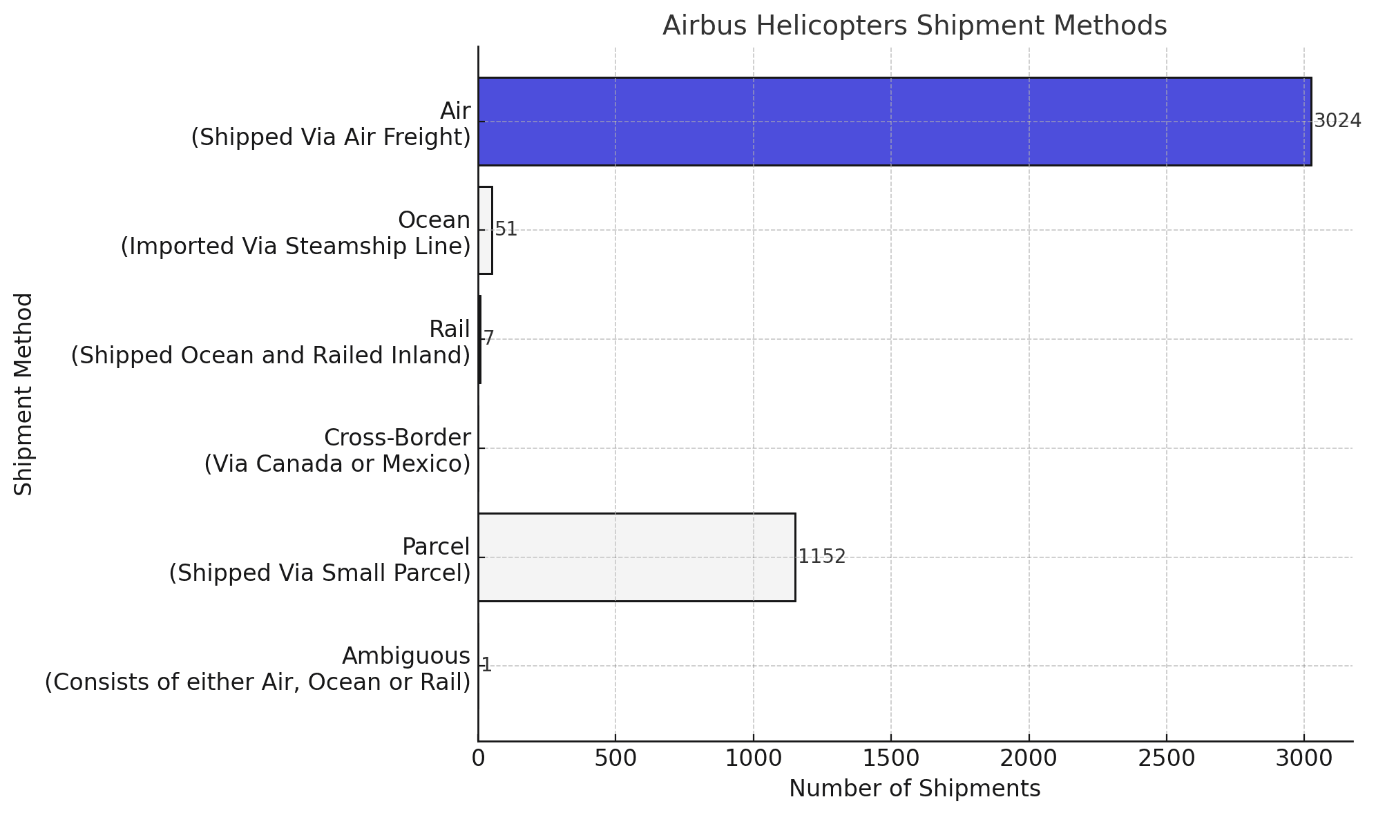 Airbus Helicopters shipment data consists of 1% ocean, 71% air, among other modes.
