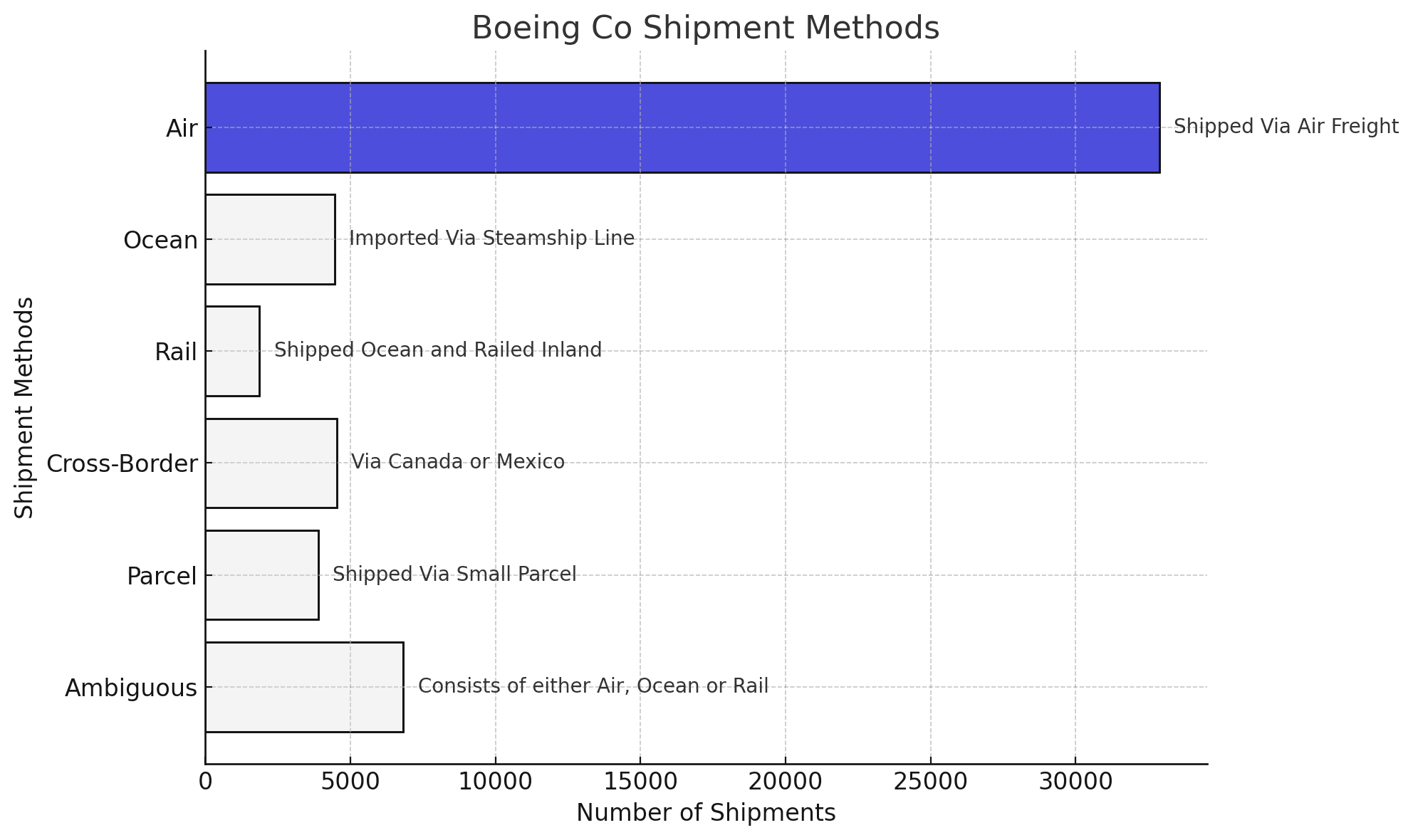 Boeing Co shipment data consists of 8% ocean, 3% rail, 60% air, 8% cross-border, among other modes.