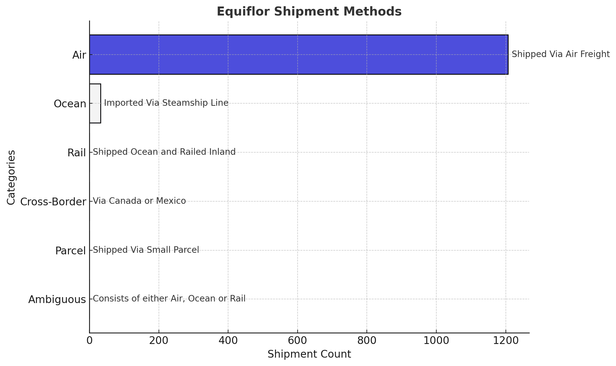 Equiflor shipment data consists of 3% ocean, 97% air, among other modes.