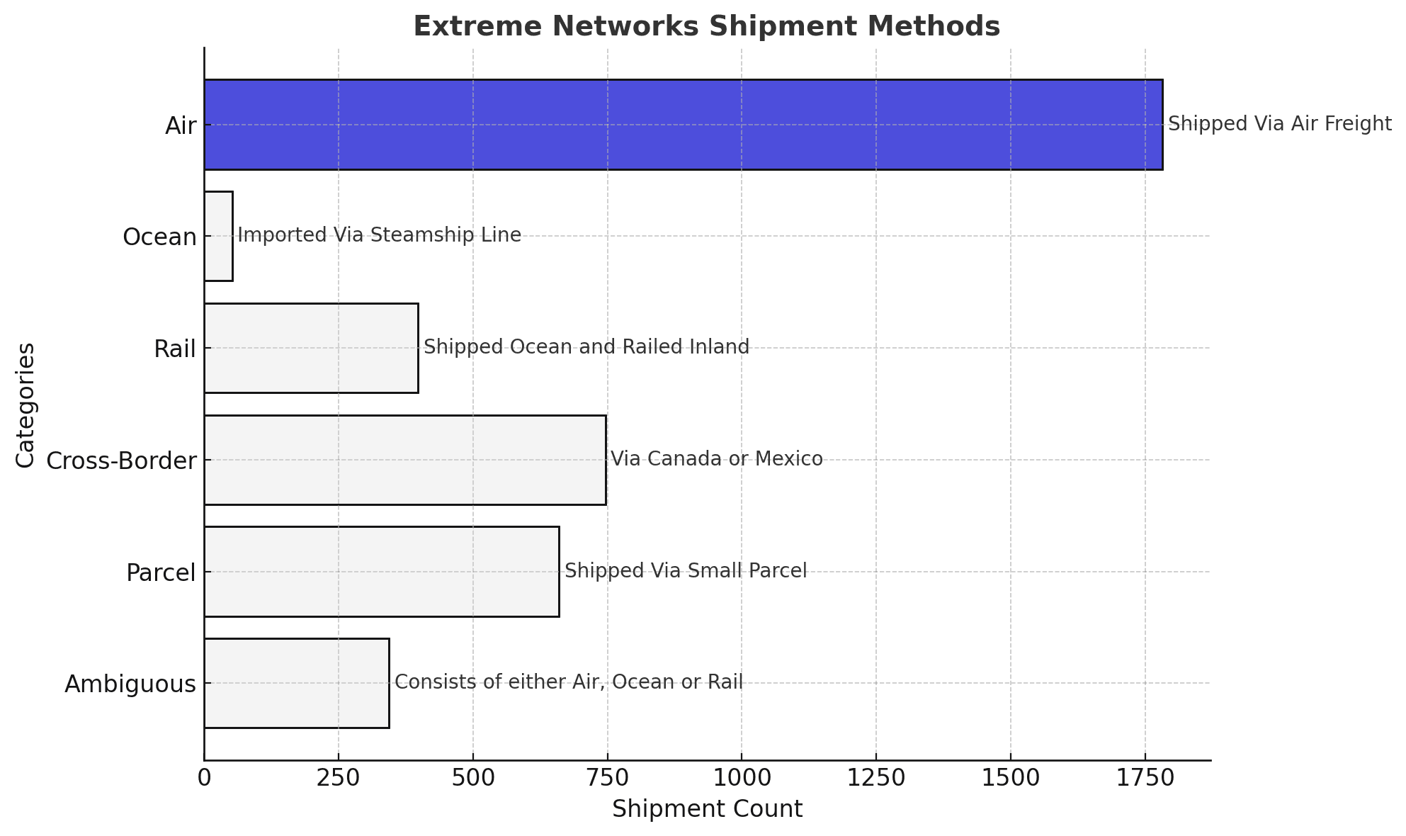Extreme Networks shipment data consists of 1% ocean, 10% rail, 45% air, 19% cross-border, among other modes.