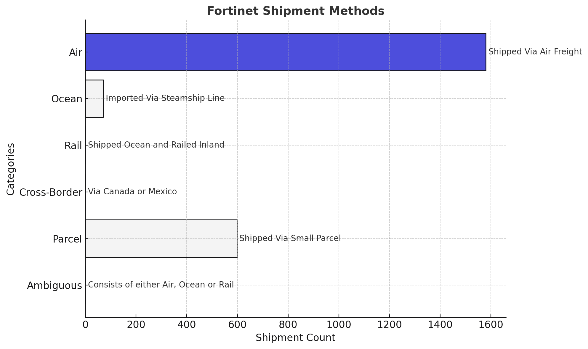 Fortinet shipment data consists of 3% ocean, 70% air, among other modes.