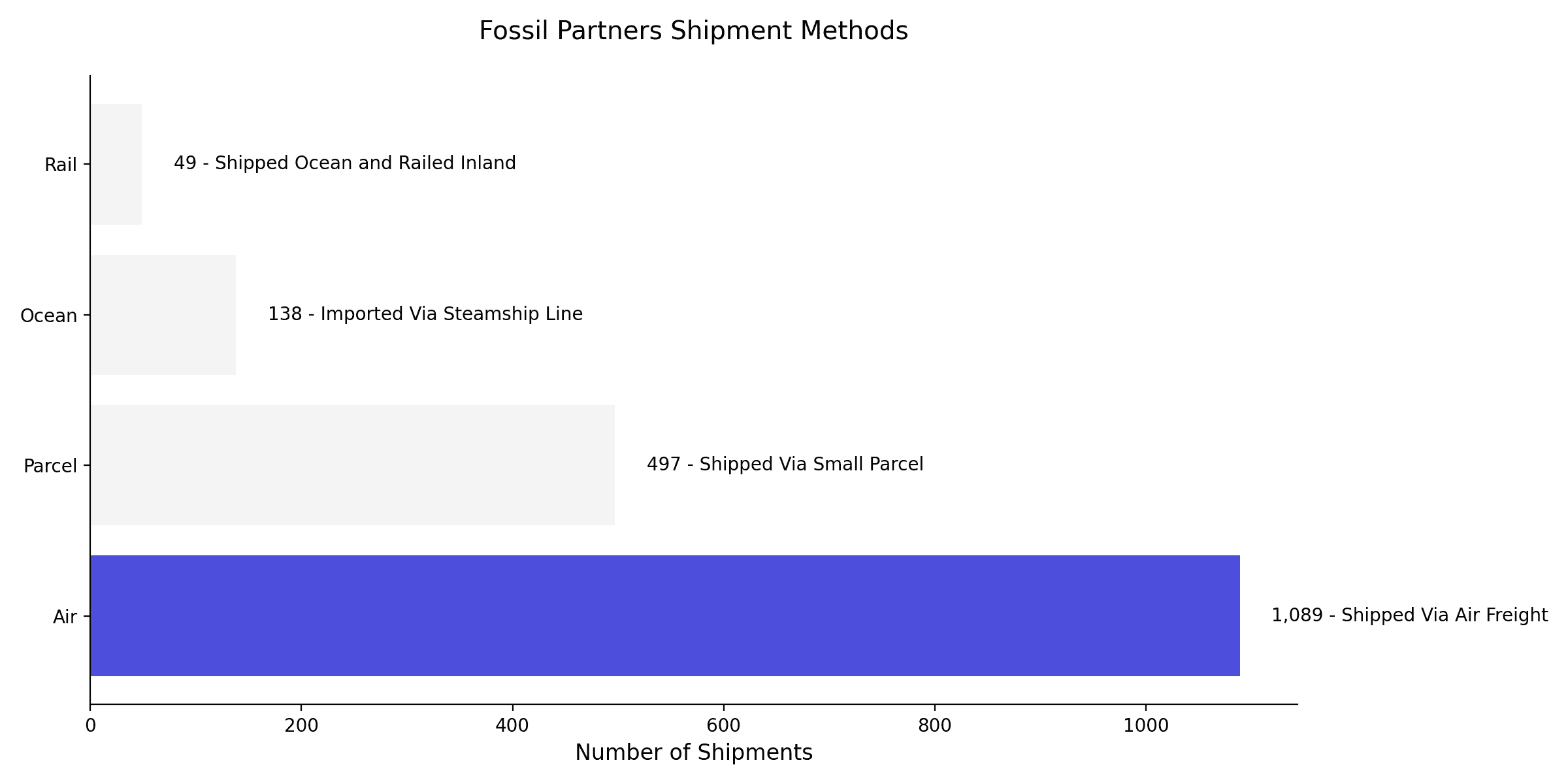 Fossil Partners shipment data consists of 8% ocean, 3% rail, 61% air, among other modes.