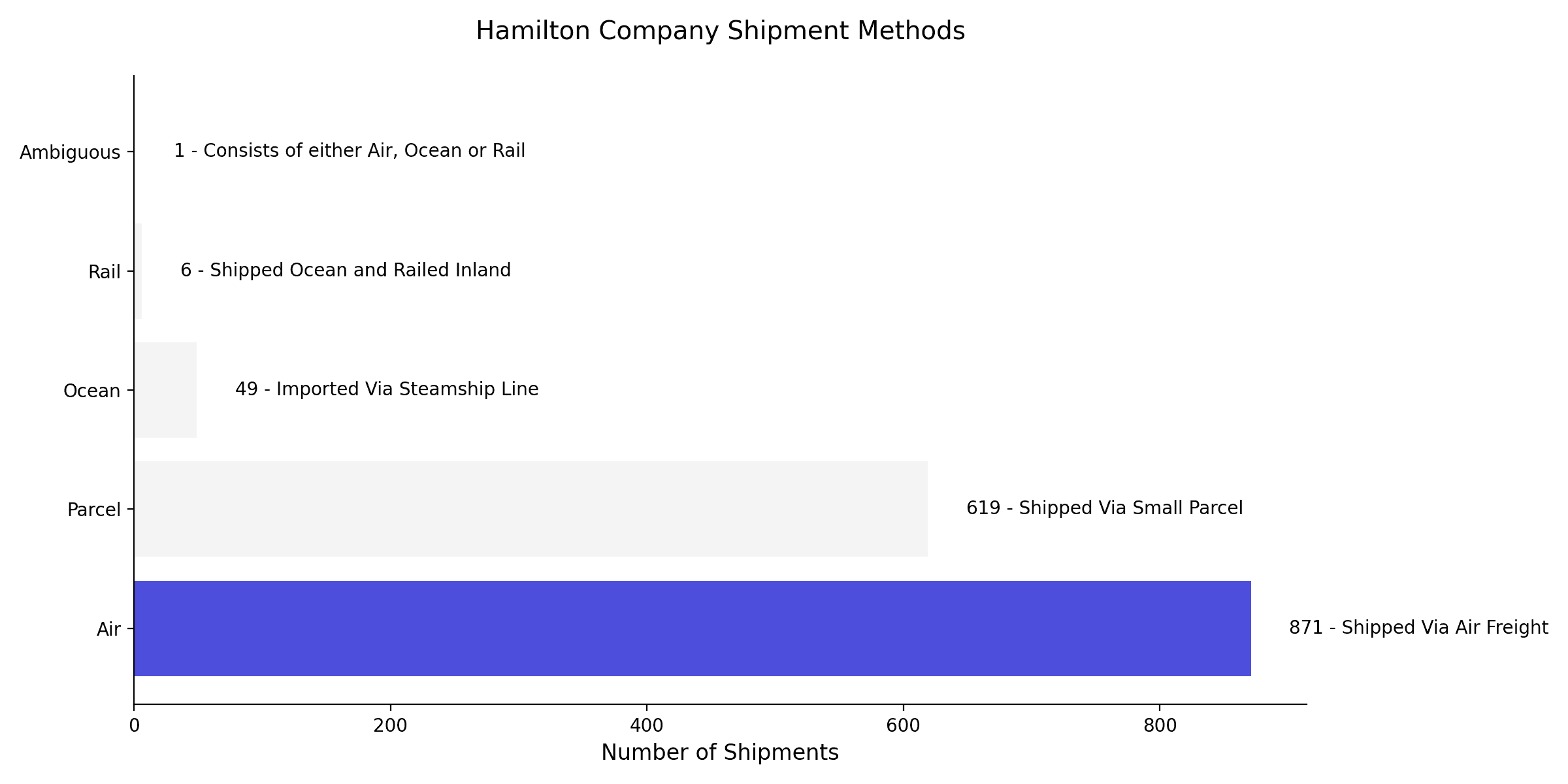 Hamilton Company shipment data consists of 3% ocean, 56% air, among other modes.