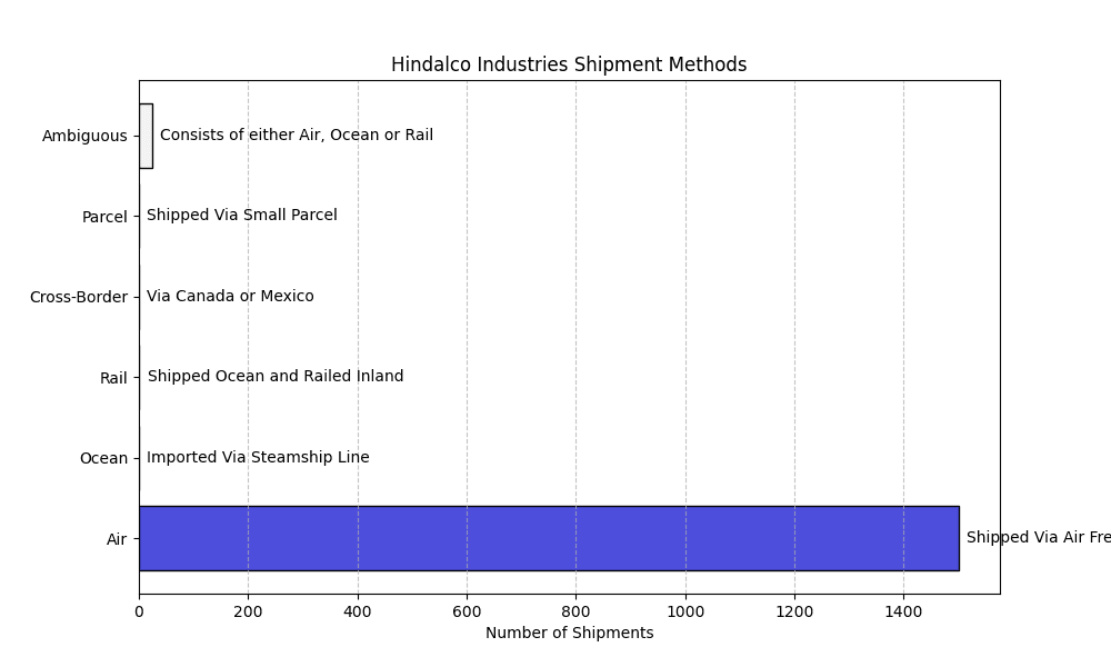 Hindalco Industries shipment data consists of 4% ocean, 84% cross-border, among other modes.