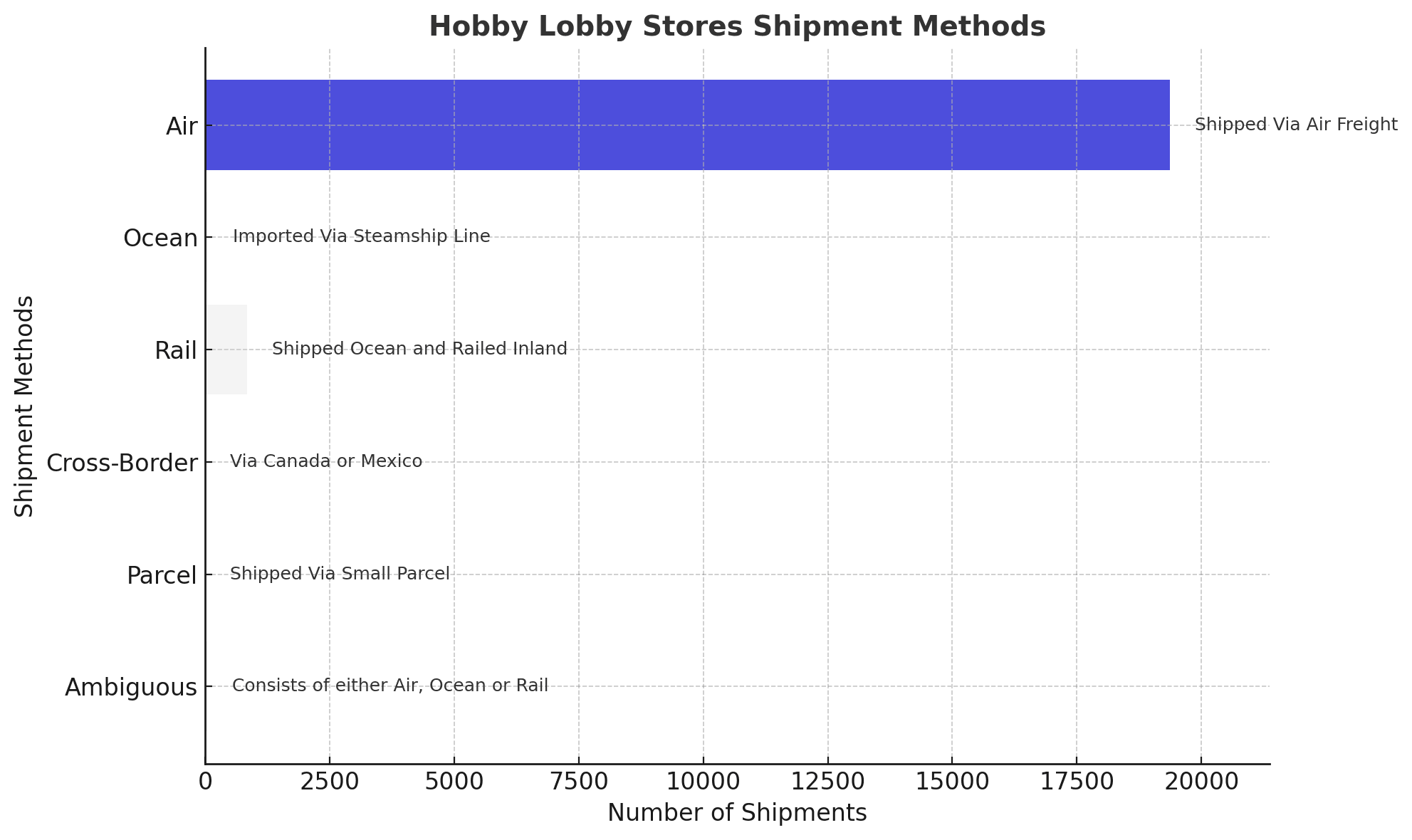 Hobby Lobby Stores shipment data consists of 4% rail, 95% air, among other modes.
