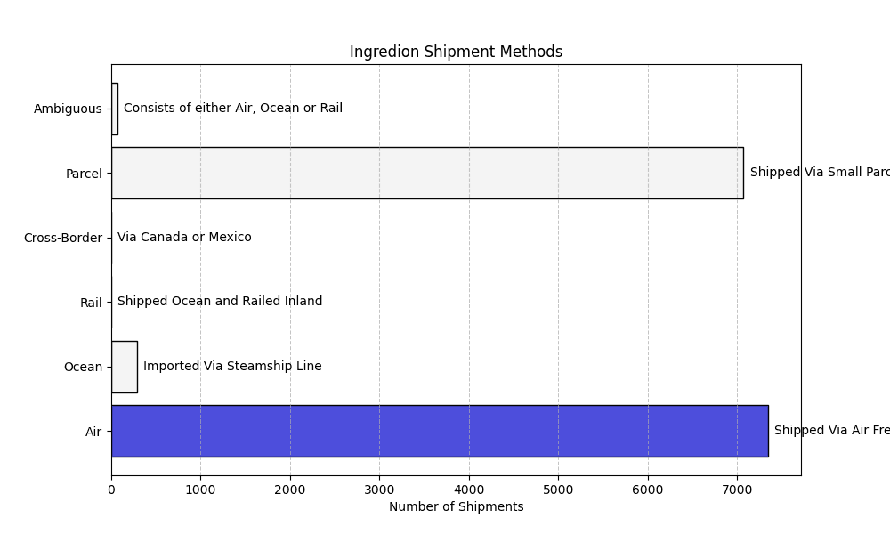 Ingredion shipment data consists of 2% ocean, 4% rail, 80% cross-border, among other modes.