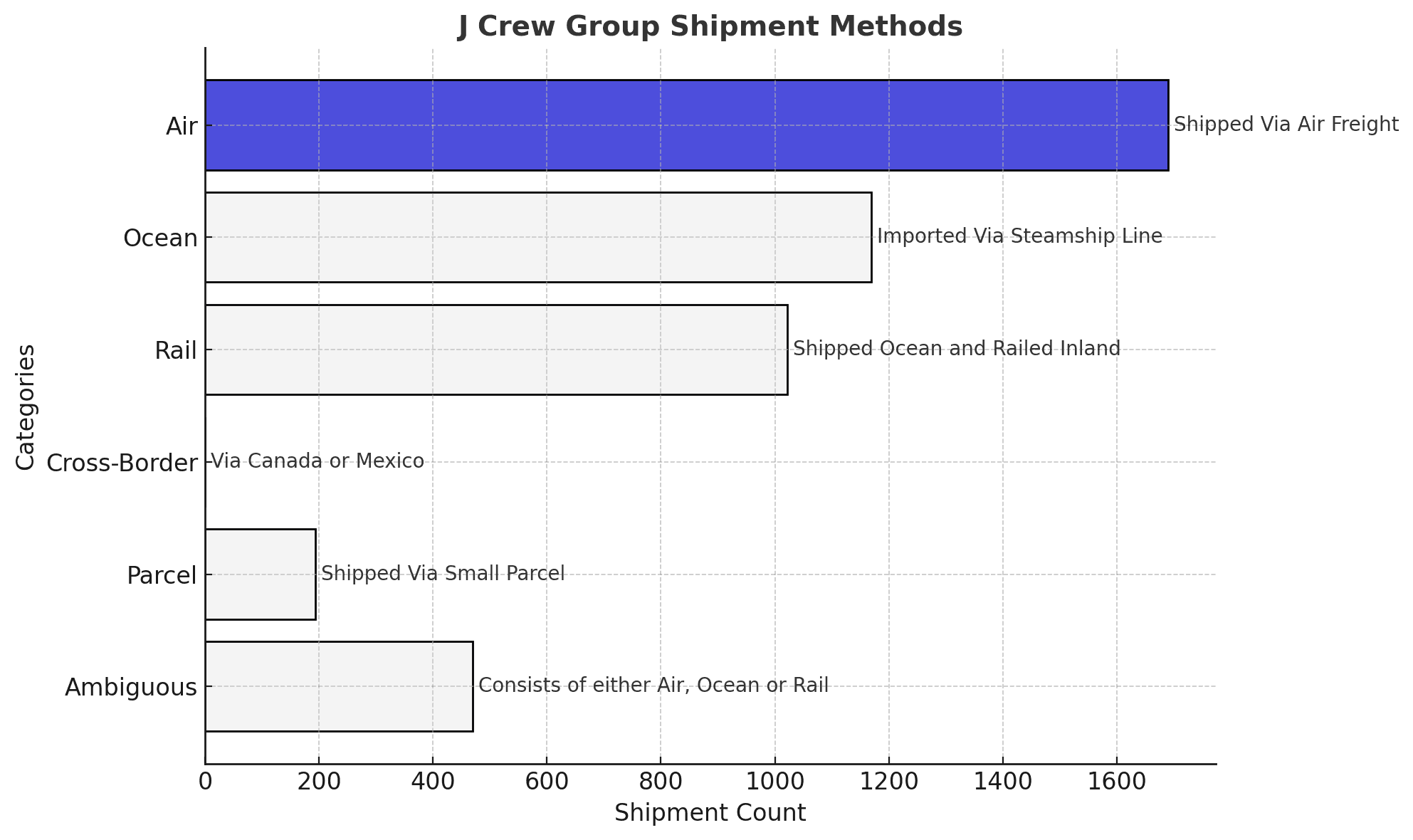 J Crew Group shipment data consists of 26% ocean, 22% rail, 37% air, among other modes.