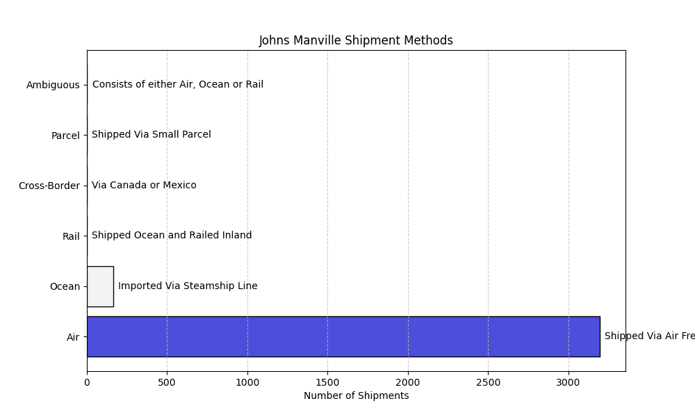 Johns Manville shipment data consists of 1% ocean, 1% rail, 3% air, 82% cross-border, among other modes.
