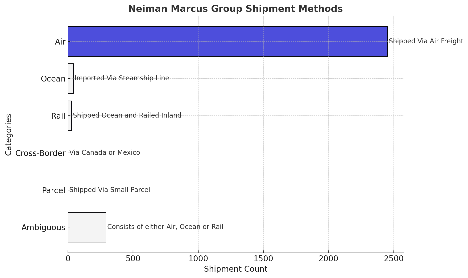Neiman Marcus Group shipment data consists of 1% ocean, 87% air, among other modes.