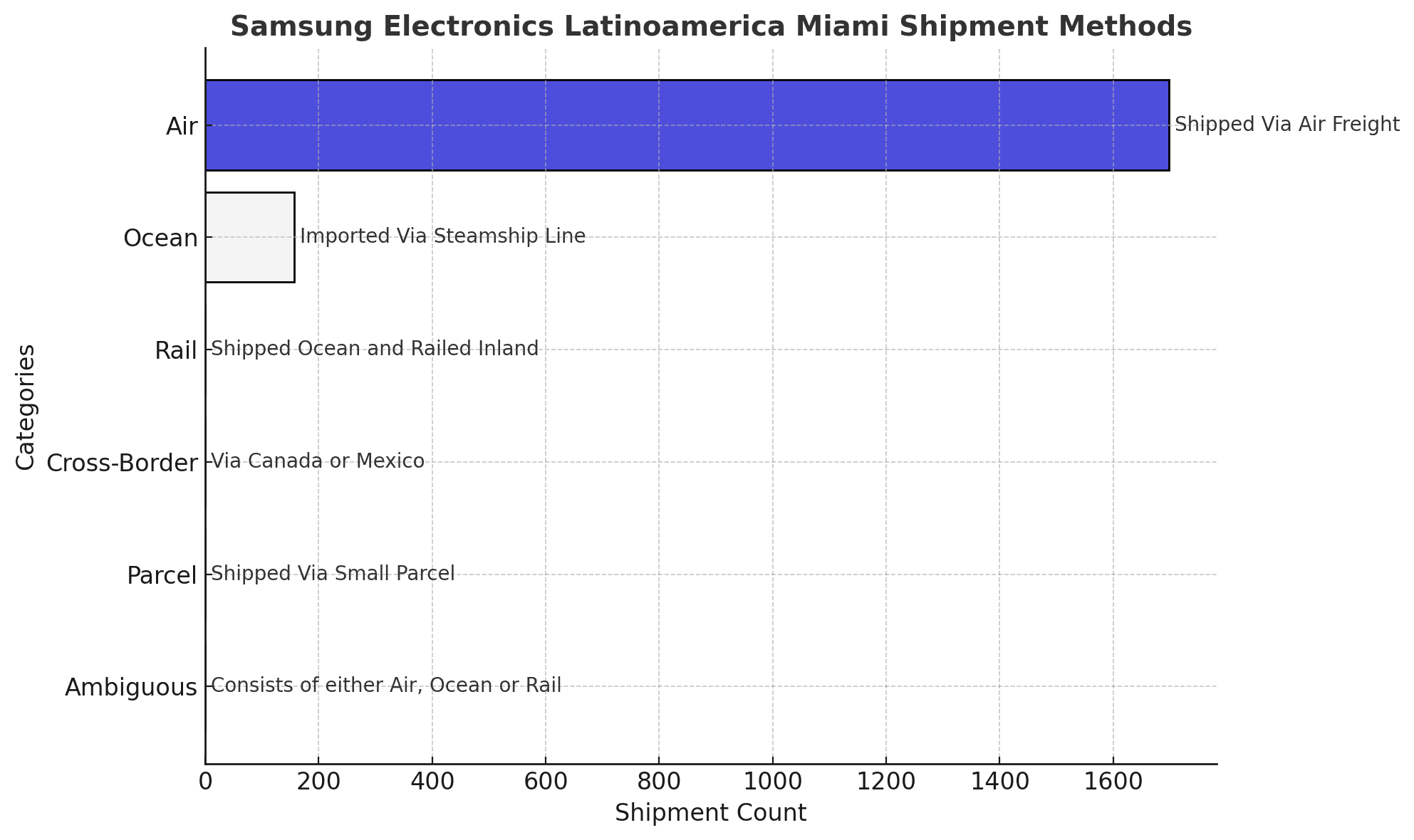 Samsung Electronics Latinoamerica Miami shipment data consists of 8% ocean, 92% air, among other modes.