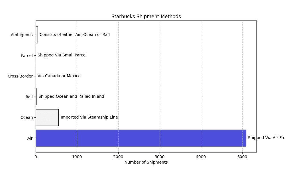 Starbucks shipment data consists of 25% ocean, 6% rail, 3% air, 54% cross-border, among other modes.