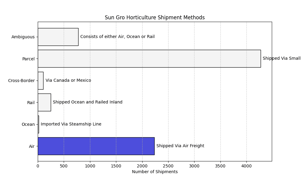Sun Gro Horticulture shipment data consists of 3% rail, 4% air, 86% cross-border, among other modes.