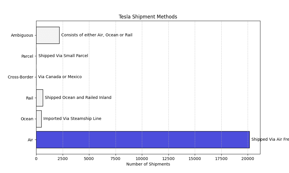 Tesla shipment data consists of 21% ocean, 4% rail, 8% air, 46% cross-border, among other modes.