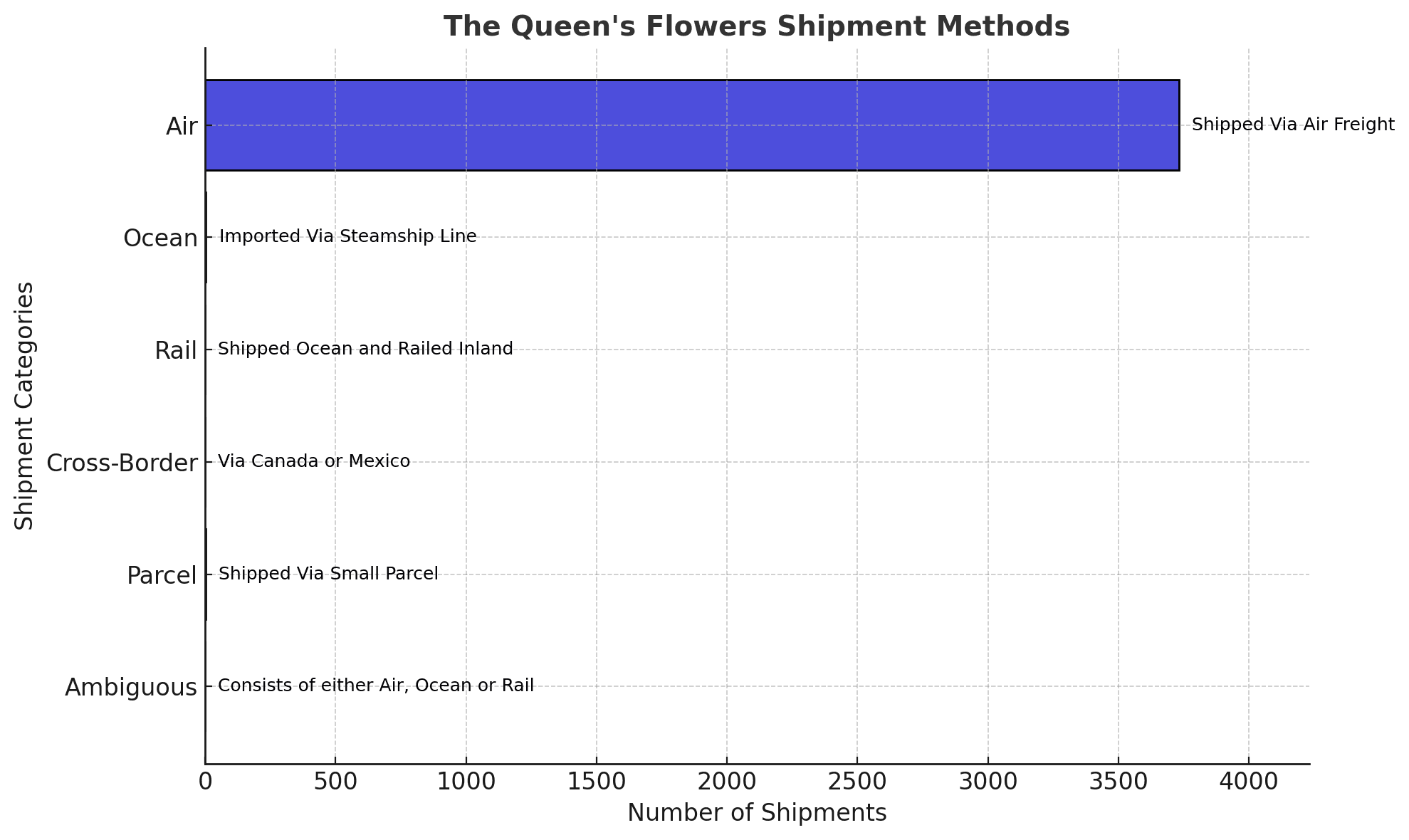 The Queen's Flowers shipment data consists of 100% air, among other modes.